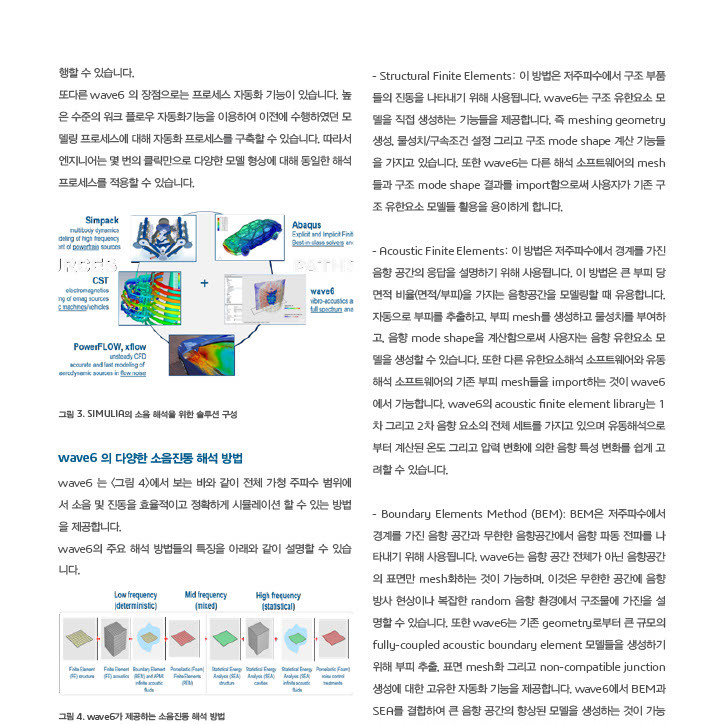 - 전 가청 주파수 해석: FEM, BEM, SEA 기법을 결합하여 소음진동 문제 해결.