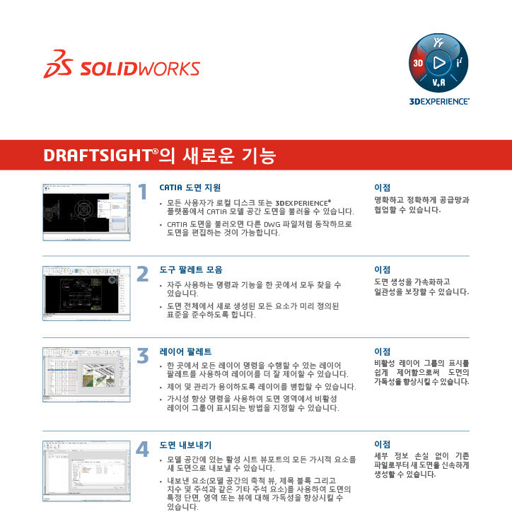 DraftSight는 CATIA 도면 지원, 도구 팔레트, 레이어 팔레트와 같은 기능을 통해 2D 설계를 더욱 효율적으로 관리할 수 있습니다.